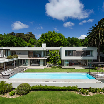 This clean-lined, graceful and stately modern 5 bedroom home is located in Bishopscourt, Cape Town. It features a triple-volume entrance hall, a seamless indoor-outdoor living space and understated but sexy finishes.
